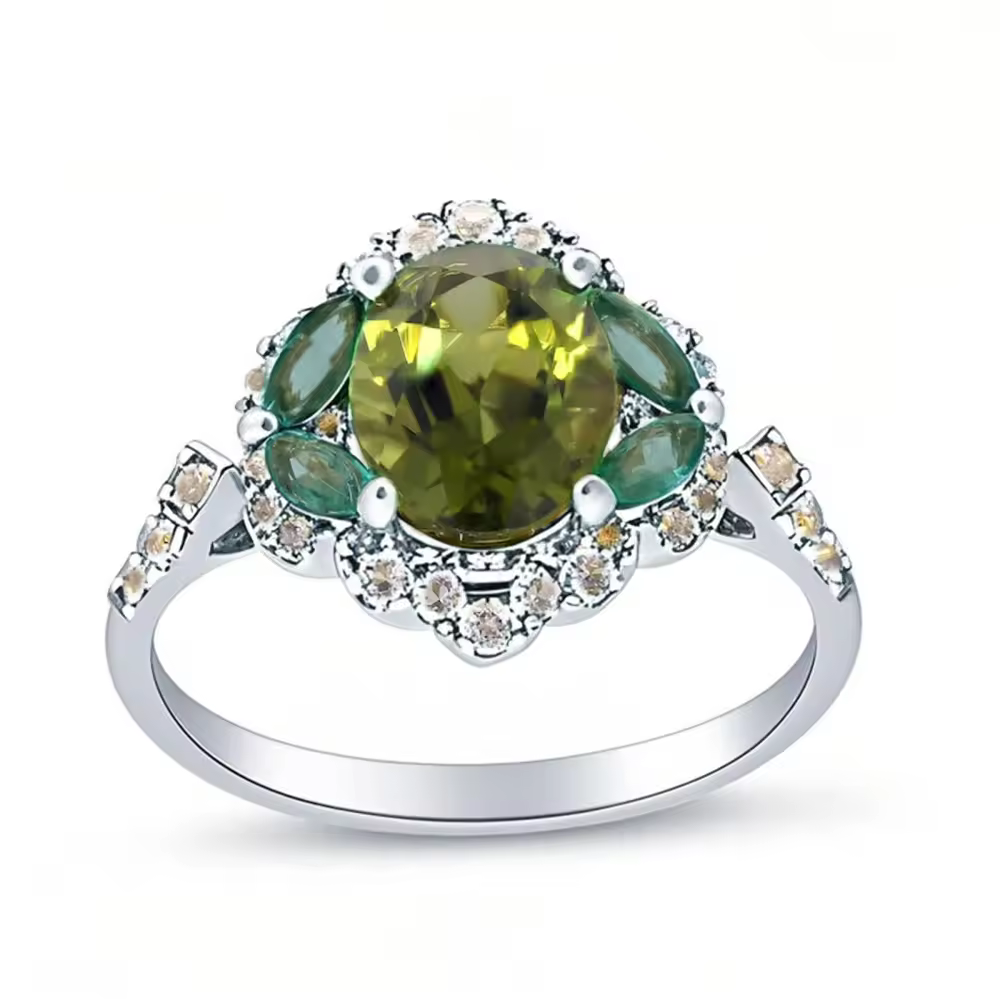 Откройте для себя наше потрясающее кольцо из 10-каратного золота, созданное специально для женщин, с великолепным крупным центральным камнем — изумрудом весом 2,8 карата, дополненным сверкающими боковыми камнями из оливина и топаза общим весом 0,8 карата. Доступное в элегантном белом золоте, это изысканное украшение дополнит любой образ, став идеальным аксессуаром как для особых случаев, так и для повседневной носки.