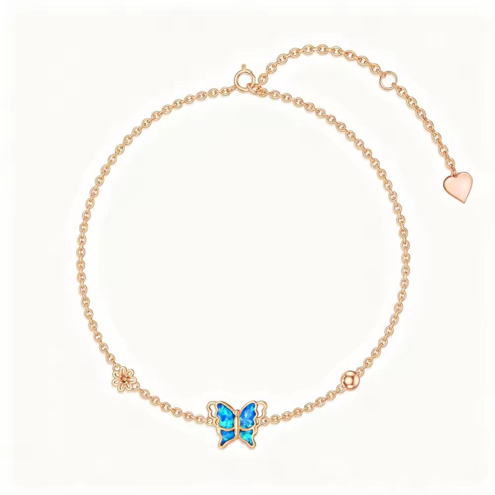 Откройте для себя наш изысканный браслет с подвесками из 18-каратного розового золота, красиво украшенный нежными опалами и очаровательными мотивами бабочек и ромашек.